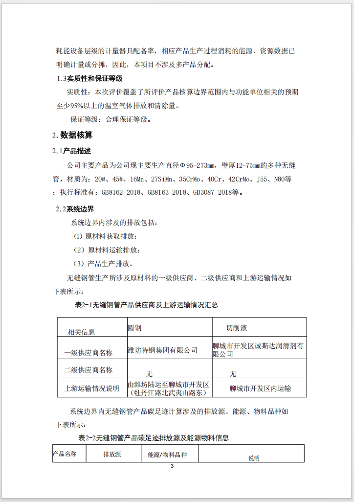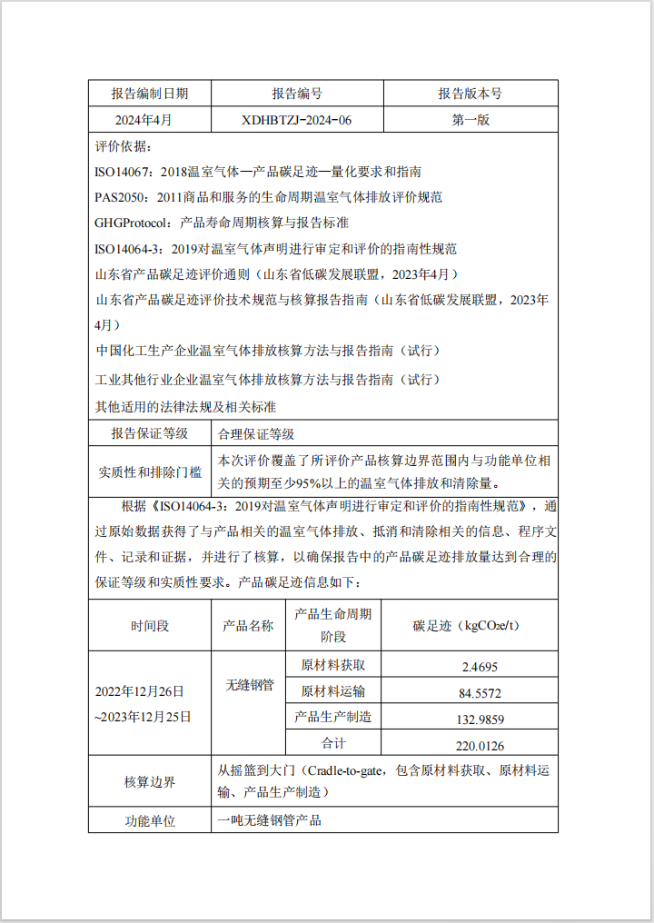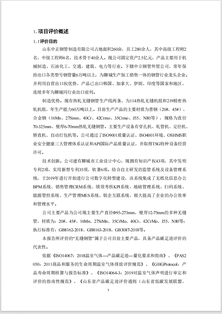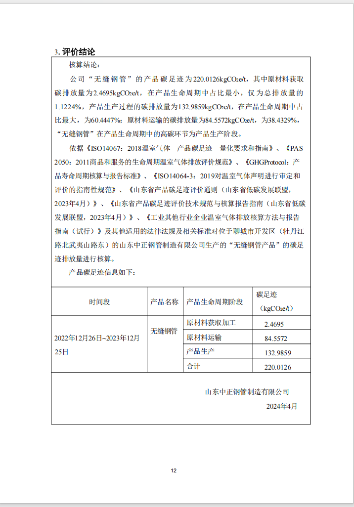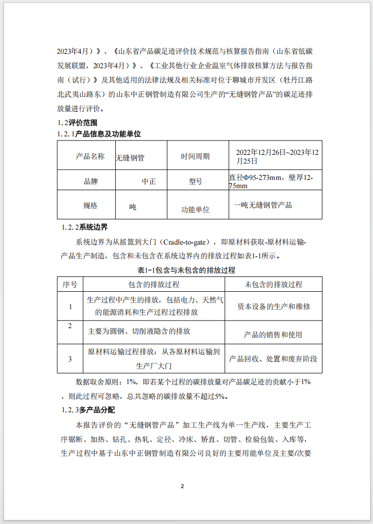 【概要描述】山東中正鋼管制造有限公司 無(wú)縫鋼管產(chǎn)品碳足跡 核算報(bào)告